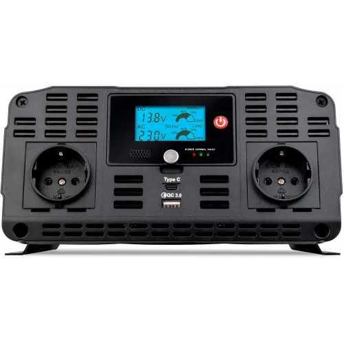 | Особенности | Чистая синусоида (PSW), порты Type-C и USB с QC, корпус ABS, LCD-экран, активное охлаждение, отслеживание ёмкости аккумулятора, медные контакты с огнестойкой оболочкой, крепления для фиксации инвертора, 6 предохранителей 40A, контакт заземления, звуковое предупреждение, система электрических защит |