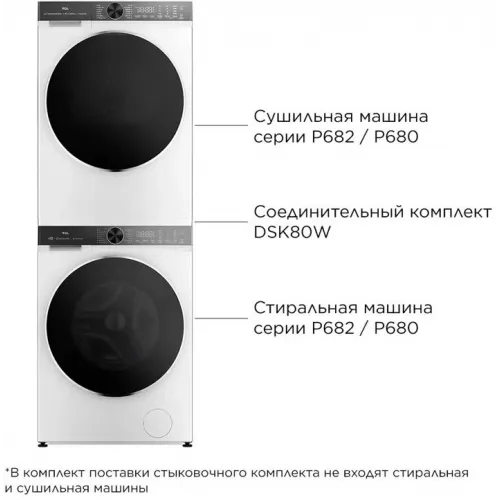 | Особенности | Совместим с полноразмерными стиральными и сушильными машинами TCL стандартной ширины и специально разработан для моделей: Серия P680: стиральная машина TCL TWOP-6809W14W1 и сушильная машина TCL TDOP-6808W; Серия P682: стиральная машина TCL TWOP-6910W14W1 и сушильная машина TCL TDOP-6908W. |