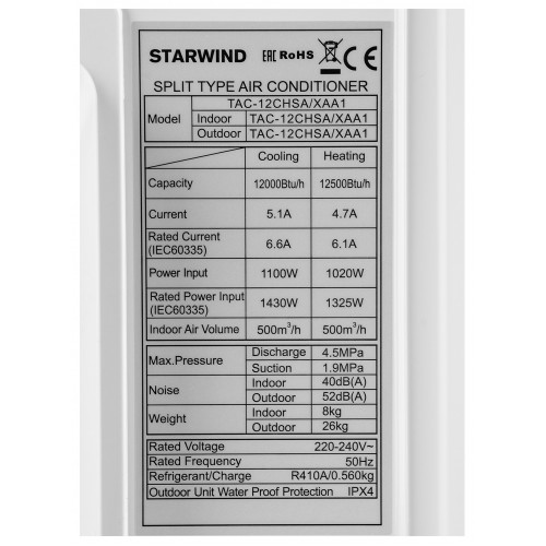 Сплит-система Starwind TAC-12CHSA/XAA1 белый