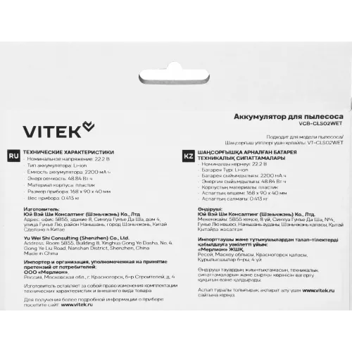 Аккумулятор Vitek VCB-CLS02WET универсальный (1предмет.)