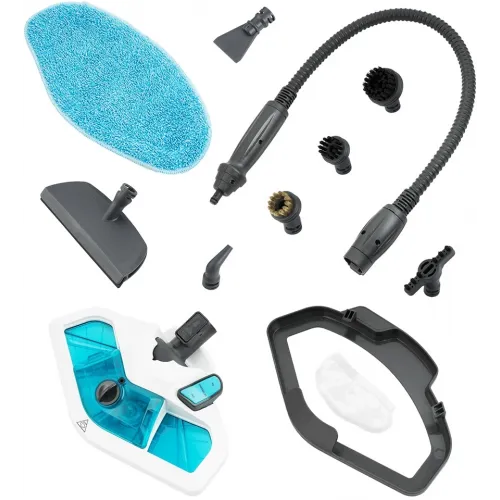 | Комплектация | Ручной модуль, базовый блок, удлинительная ручка, щетка для пола, тряпка для пола, рамка для ковра, круглые нейлоновые щетки - 3 шт., угловая насадка, скребок, плоская нейлоновая щетка, насадка для отпаривания, тряпка для отпаривания, удлинительный шланг. |