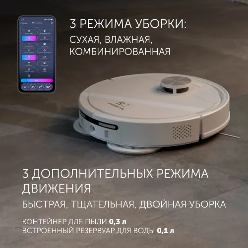 | Особенности | Голосовое сопровождение и оповещения, Запрет влажной уборки на коврах, Очистка и сушка насадок для влажной уборки, Плоский корпус для удобства уборки под мебелью, Полностью автоматическая уборка, Распознавание препятствий, Сохранение карты, Управление с голосовыми помощниками, Функция "найди меня" |