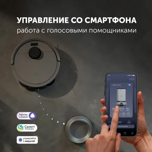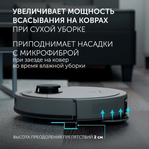 | Особенности | Голосовое сопровождение и оповещения, Запрет влажной уборки на коврах, Очистка и сушка насадок для влажной уборки, Плоский корпус для удобства уборки под мебелью, Полностью автоматическая уборка, Распознавание препятствий, Сохранение карты, Управление с голосовыми помощниками, Функция "найди меня" |