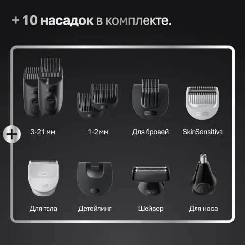 Насадки | насадка для коротких волос (1-10 мм), насадка для длинных волос (11-20 мм), насадка для щетины (1 мм), насадка для щетины (2 мм), насадка для детейлинга, насадка для точных контуров, насадка для тела, насадка для тела для чувствительной кожи, насадка для ушей и носа, насадка для бровей |