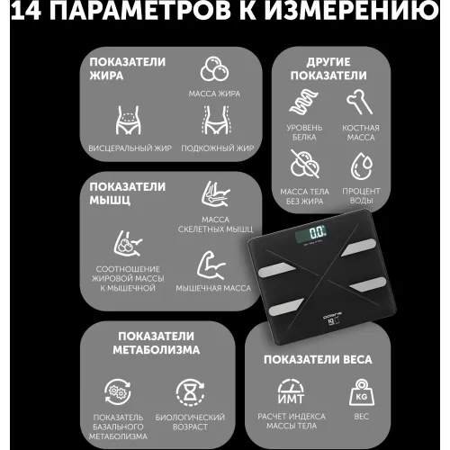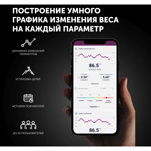 | Дополнительные измерения параметров тела | возраст тела, определение доли белков, определение доли воды, определение доли жировой ткани, расчет ИМТ |