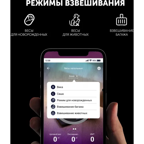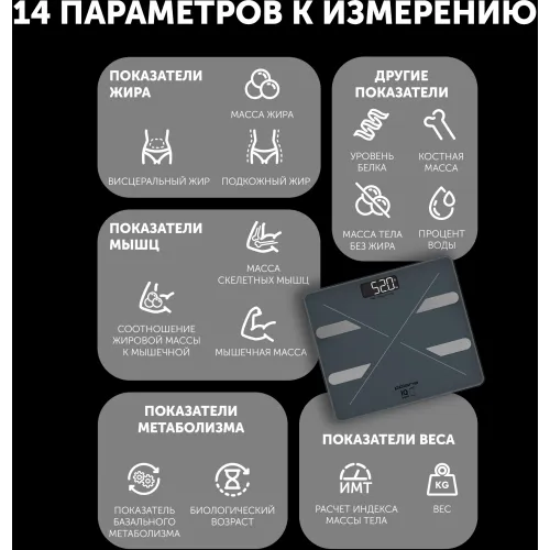 | Дополнительные измерения параметров тела | возраст тела, определение доли белков, определение доли воды, определение доли жировой ткани, расчет ИМТ |