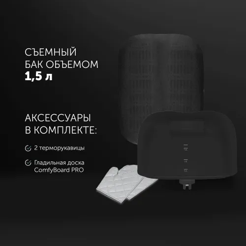 Особенности | Устраняет запахи и убивает бактерии; в комплекте Гладильная доска ComfyBoard PRO и 2 терморукавицы |