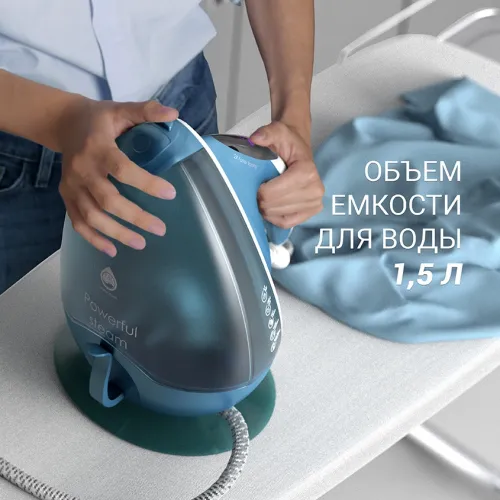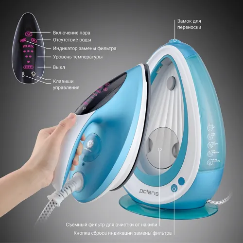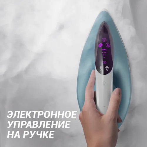 | Особенности | Электронное управление на ручке. Автоотключение при отсутствии воды. Замок для удобной переноски прибора. Удобная фиксация парового шланга и шнура на базе. Мощность 2400 Вт. Режимы работы: сухое глажение; мощность постоянного пара до 120 г/мин; вертикальное отпаривание. |