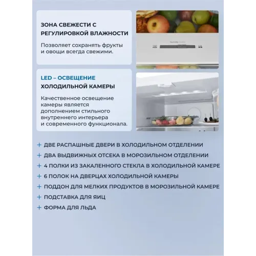 | Особенности холодильника | LED подсветка, дисплей, контроль влажности, система самодиагностики |