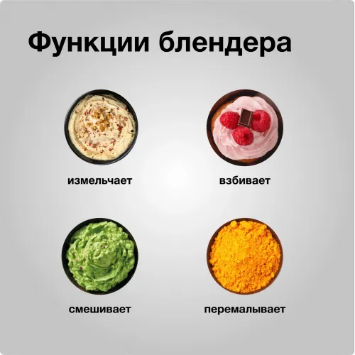 | Функциональные особенности | измельчение твердых продуктов, регулировка скорости вращения, режим колки льда, режим Турбо, функция взбивания |