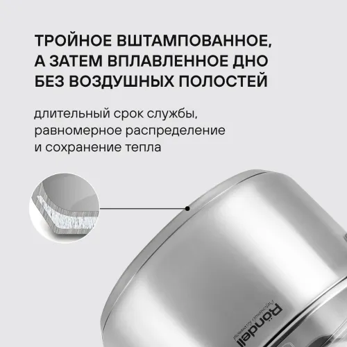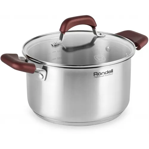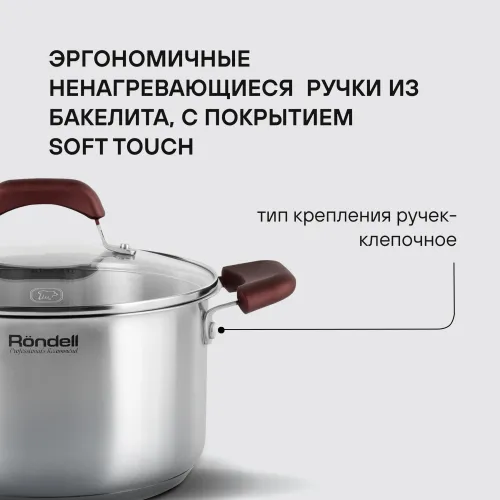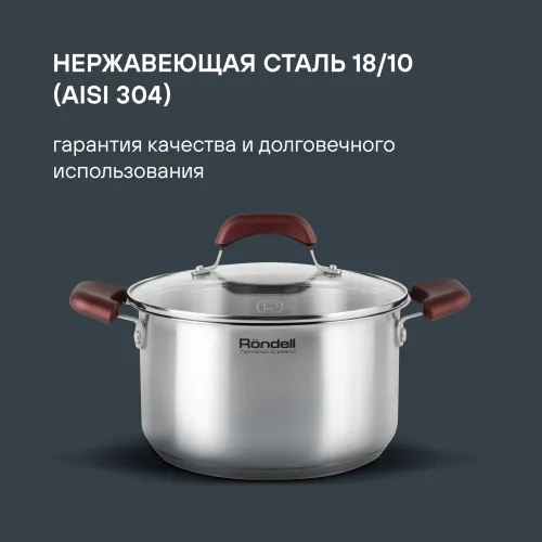 Особенности | Материал: высококачественная нержавеющая сталь 18/10. Внутреннее покрытие: без покрытия. Толщина стенок: 0,5 мм. Толщина дна: 5,0 мм. Материал крышки: термостойкое стекло. Аксессуары: из бакелита, с покрытием Soft Touch. Преимущества: высокие стенки корпуса – большой литраж посуды. |