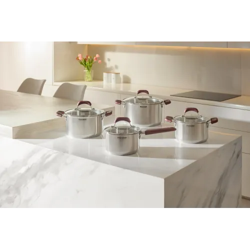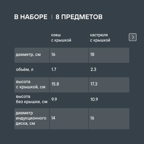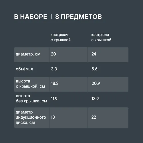 Состав комплекта | Три кастрюли 18 см (2,3 л), 20 см (3,3 л), 24 см (5,6 л), ковш 16 см (1,7 л), со стеклянными крышками |