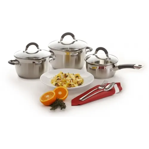 | Состав комплекта | Ковш с/кр 16 см, кастрюли с/кр 20 и 24 см, сковорода б/кр 26 см Flamme |