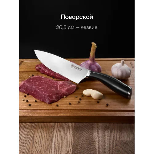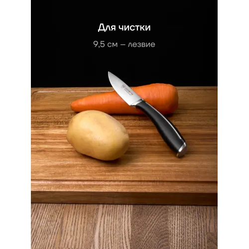 Состав комплекта | поварской нож - лезвие 20 см., нож кухонный универсальный – лезвие 12,5 см, овощной нож для чистки и нарезки овощей и фруктов – лезвие 9 см |