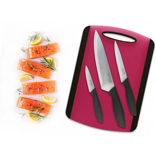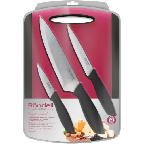| Состав комплекта | Нож поварской 20 см, нож универсальный 12 см, нож для овощей 10 см, доска разделочная 34*24*0,8 см |