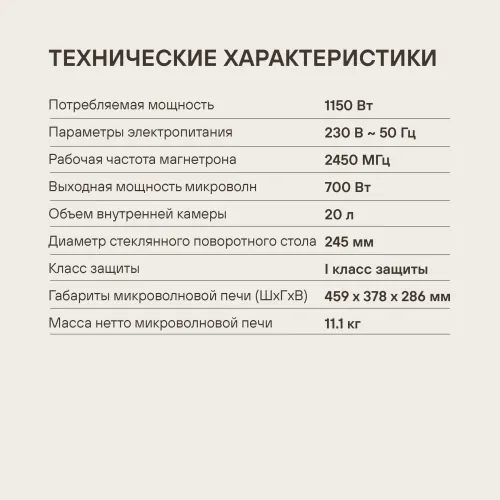 | Функции | блокировка от детей, остановка поворотного стола, память рецептов, программирование процесса приготовления, таймер |