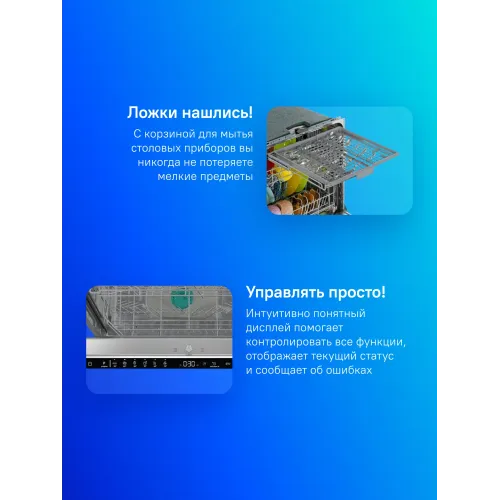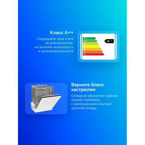 Внутренняя конструкция | корзина для столовых приборов, полки для кружек, разбрызгиватель над верхней корзиной, регулируемая по высоте корзина для посуды, складные держатели тарелок |