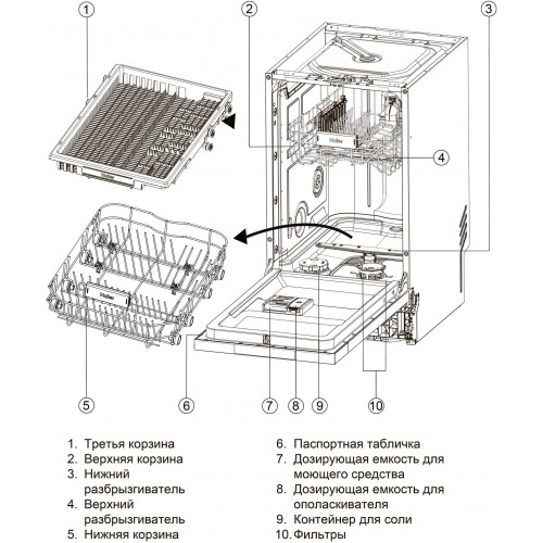 | Внутренняя конструкция | корзина для столовых приборов, освещение, полки для кружек, регулируемая по высоте корзина для посуды, складные держатели тарелок |