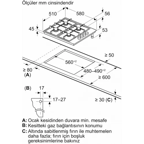 Газовая варочная поверхность Bosch PBP6C5K80O нержавеющая сталь