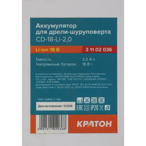 | Ссылка на сайт вендора | https://kraton.ru/catalog/instrument/akkumulyatornyy_instrument/akkumulyatory/akkumulyator_dlya_dreli_shurupoverta_kraton_cd_18_li_2_0/ |