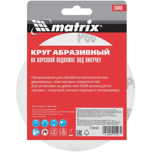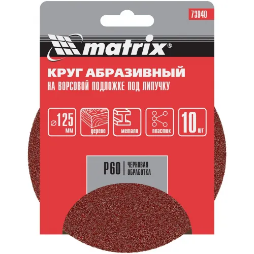| Описание | Абразивный круг на ворсовой подложке под «липучку» Matrix Р60 арт. 73840 используется для сухого чернового шлифования металла, дерева, пластика и других поверхностей. |