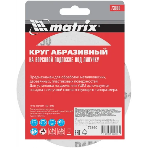 | Описание | Абразивный круг на ворсовой подложке под «липучку» Matrix Р150 арт. 73860 используется для сухого чистового шлифования металла, дерева, пластика и других поверхностей. |