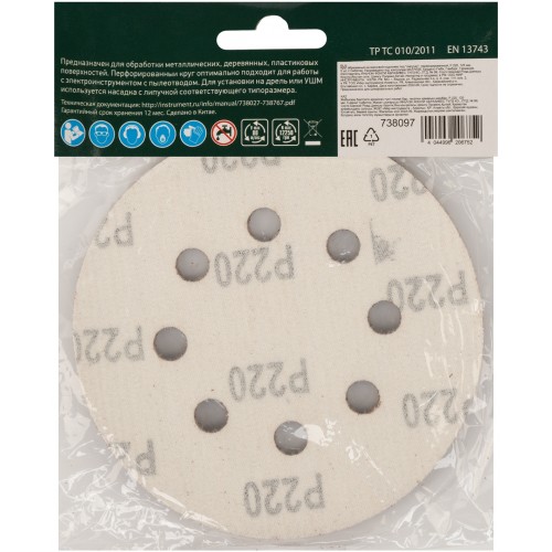 | Описание | Круг абразивный на ворсовой подложке под "липучку", перфорированный, P 220, 125 мм, 5 шт. |