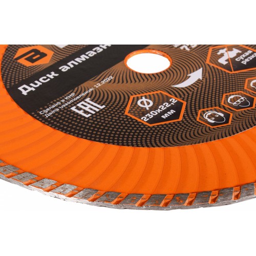 Описание | Диск алмазный отрезной Турбо 230 х 22,2 мм, сухая резка Вихрь - это алмазный отрезной диск, который используется совместно с угловыми шлифмашинами (болгарками) для сухой резки гранитных, бетонных, кирпичных и каменных изделий. |