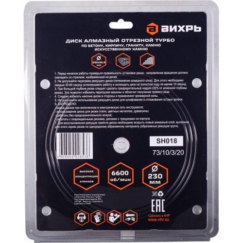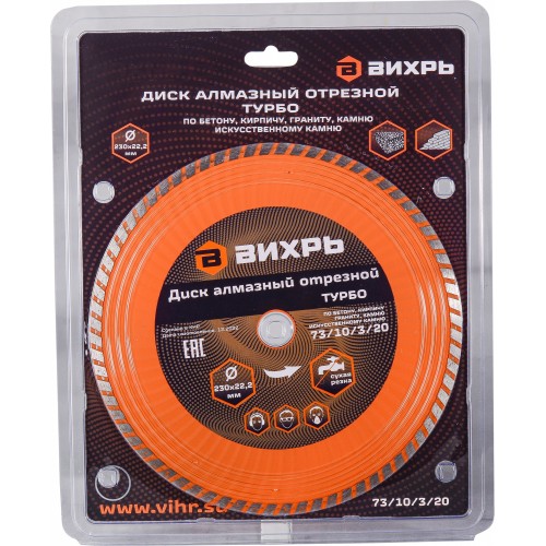 Диск алмазный по камню Вихрь 73/10/3/20 d=230мм d(посад.)=22.2мм (угловые шлифмашины)