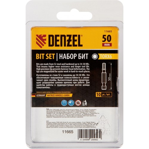 | Состав набора | Набор бит TORX 6х50, сталь S2, шестигранный профиль, 10 шт. |