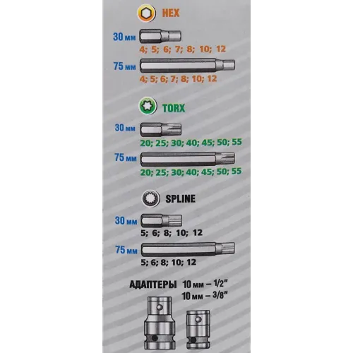 | Состав набора | Биты из хромомолибденовой стали S2. Набор бит Spline. |