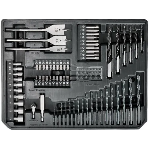 | Состав набора | Биты 25 мм. 20 шт.; биты 50 мм. 10 шт.; головки торцевые 10 шт.; сверло по дереву перовое 3 шт., сверло по дереву спиральное 6 шт., сверло по металлу 18 шт., зенкер, держатель бит магнитный, шаблон, кейс |