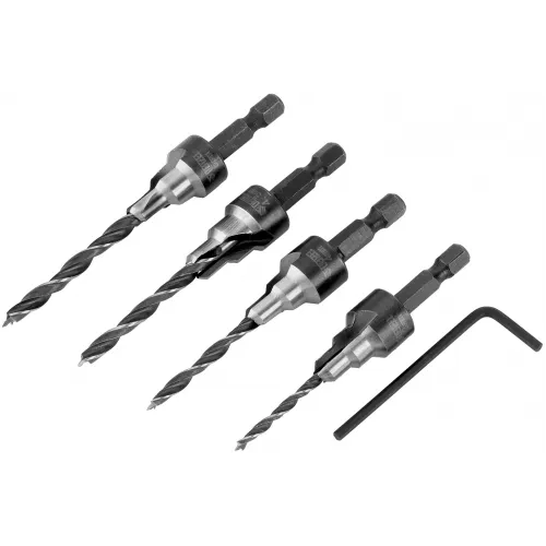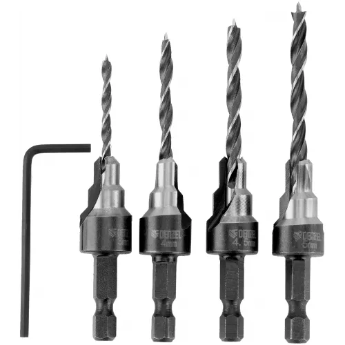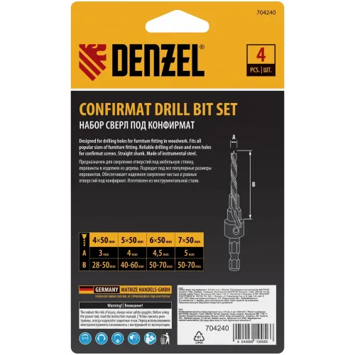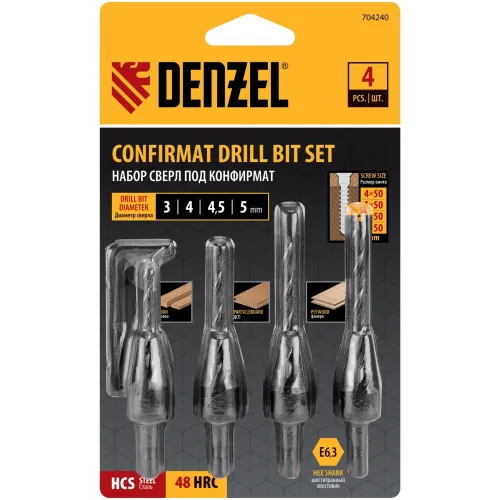 Состав набора | Набор сверл под конфирмат Denzel 704240 включает 4 оснастки диаметром 3-5 мм, предназначенные для получения отверстий под евровинты в древесине, фанере и ДСП. Сверла устанавливаются в патрон электрической дрели или сверлильного станка и подходят для конфирматов размером 4х50, 5х50, 6х50 и 7х50 мм. |