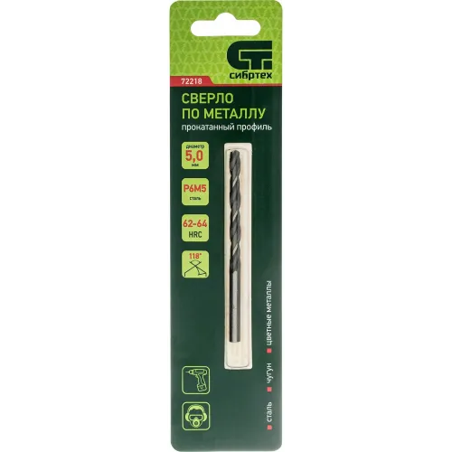 Сверло Сибртех 72218 по металлу Д=5мм Дл=86мм (1пред.) для дрелей