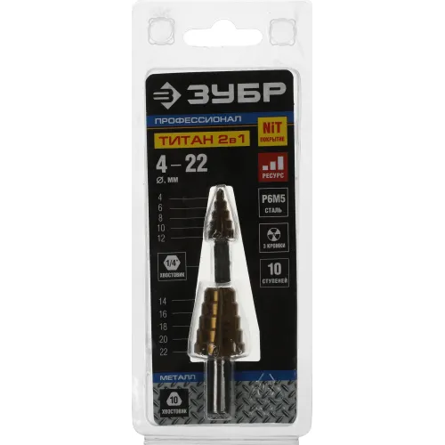Описание | ЗУБР 4-22 мм, 11 ступеней, сверло ступенчатое составное, покрытие NiT |
