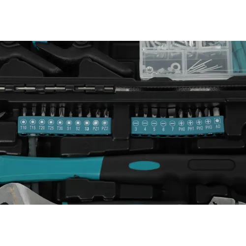 Комплектация | жесткий кейс, набор бит, набор гаечных ключей, набор головок, набор крепежа, набор отверток, набор шестигранных ключей |