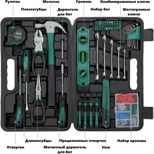 | Комплектация | жесткий кейс, набор бит, набор гаечных ключей, набор крепежа, набор отверток, набор шестигранных ключей |