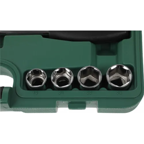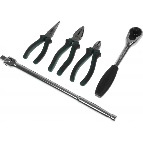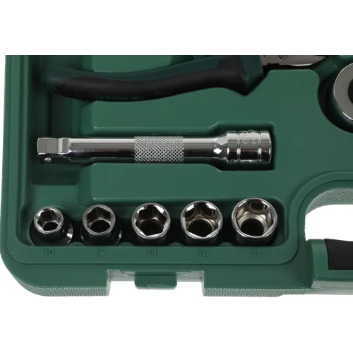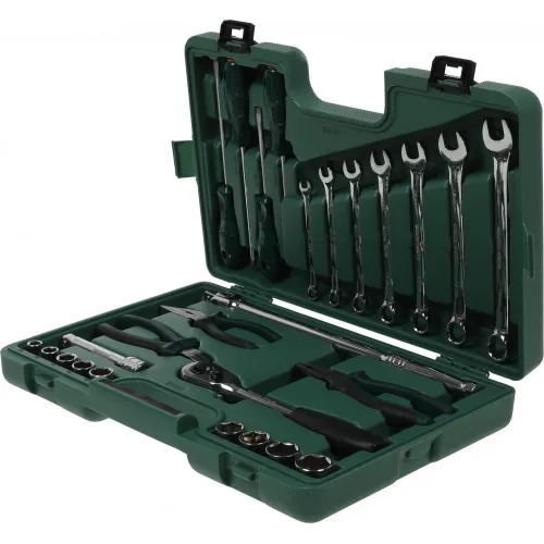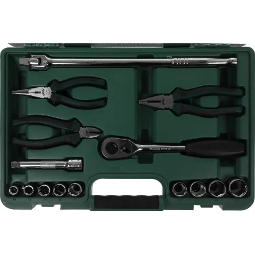 | Особенности | Головки торцовые 1/2" 6 граней: 10, 12, 14, 16, 17, 19, 21, 22, 24мм. Ключи комбинированные: 8, 10, 12, 14, 16, 17, 19мм. Ключ трещеточный 1/2". Удлинитель 1/2" 125мм. Рычаг угловой 1/2" 260мм. Отвертки Phillips: РН2х100мм, РH2х150мм. Отвертки шлицевые: 6х100мм, 6х150мм. Тонкогубцы 150мм. |