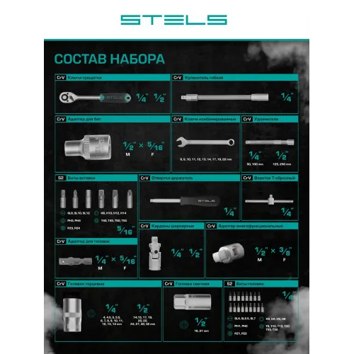 | Описание | Набор инструментов Stels 14105, 1/2 и 1/4 дюйма, CrV, состоит из 82 предметов в пластиковом кейсе и предназначен для выполнения слесарно-монтажных работ. Включает инструменты и насадки для работы с резьбовыми крепежами. Универсальный комплект будет полезен при проведении авторемонта. |