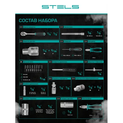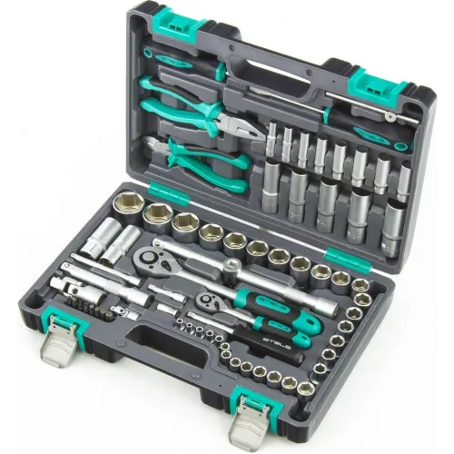 | Описание | Набор инструментов Stels 14108, 1/2 и 1/4 дюйма, CrV, состоит из 69 предметов в пластиковом кейсе и предназначен для выполнения слесарно-монтажных работ. Включает инструменты и насадки для работы с резьбовыми крепежами, а также бокорезы и пассатижи, расширяющие возможности использования набора. |