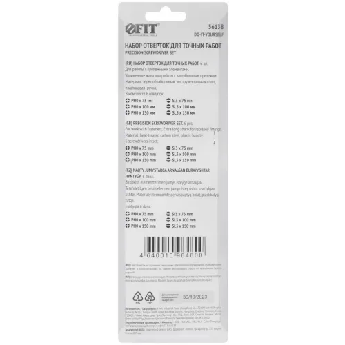 | Особенности | Отвертки для точных работ удлиненные 6 шт., PH/SL FIT 56138 SL3 x 75 мм; SL3 x 100 мм; SL3 x 150 мм; PH0 x 75 мм; PH0 x 100 мм; PH0 x 150 мм. Материал: усиленная инструментальная сталь, пластиковая ручка. Упаковка: блистер |
