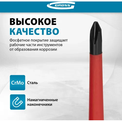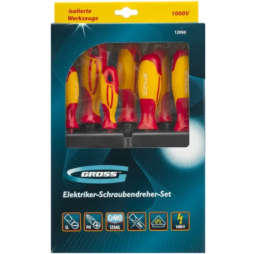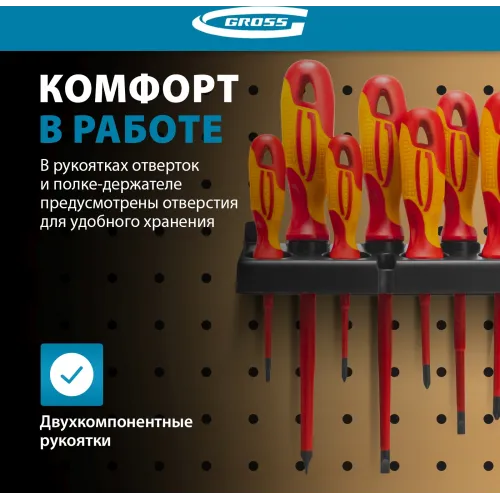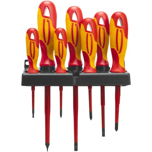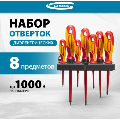 | Описание | Набор отверток диэлектрических до 1000 В, тестер, CrMo, двухкомпонентные рукоятки, 8 предм. |
