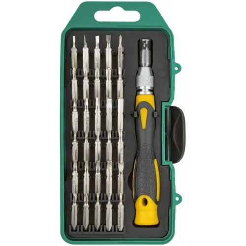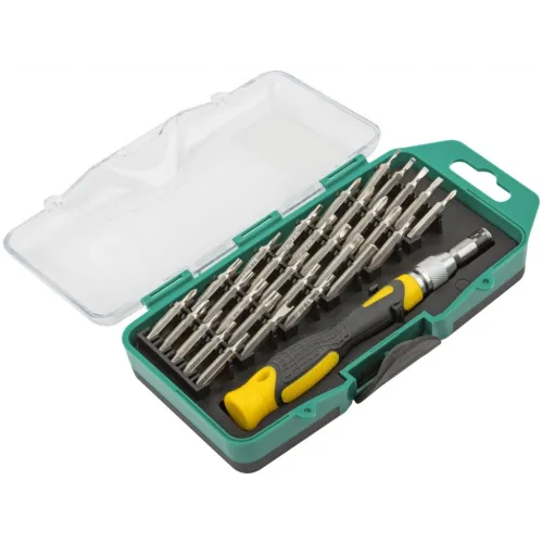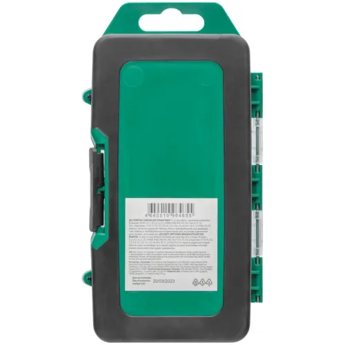 | Описание | Отвертка с битами для точных работ, 30 CrV бит, пластиковый бокс FIT 56189. В наборе: биты: 30 шт. SL1.5, SL2, SL2.5, SL3; PH000, PH00, PH0, PH1, PH2; T4, T5, T6; Torx с отверстием: Т7, T8, T9, T10, T15, T20; Н1.5, H2, H2.5, H3, H4, H4.5; Y-тип Y0, Y1; U-тип U3; Pentalobe P0.8, P1.5, P2. |