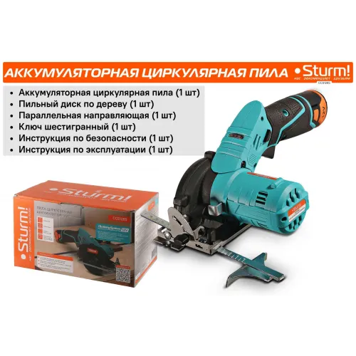 | Комплект поставки | Аккумуляторная циркулярная пила, пильный диск по дереву, параллельная направляющая, ключ шестигранный, инструкция по безопасности, инструкция по эксплуатации. |
