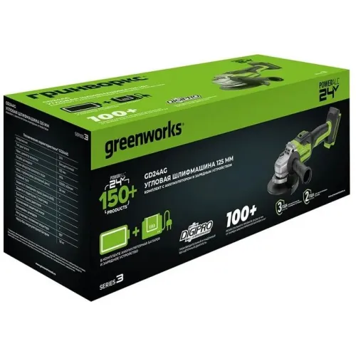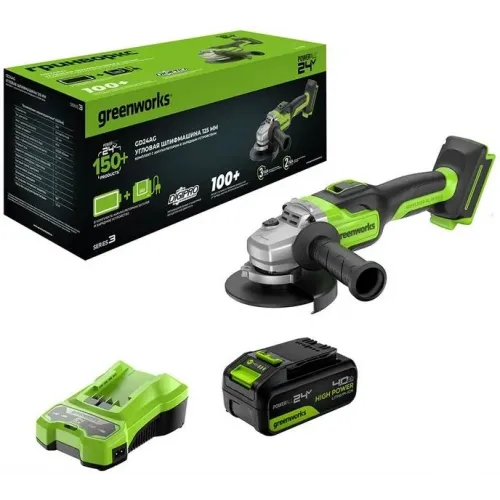 | Комплект поставки | Угловая шлифовальная машина Greenworks 3200207CUB (GD24AG); АКБ 4Ач High Power; быстрое зарядное устройство Greenworks G24C4, 24V, 4А (2946407); защитный кожух; боковая рукоятка; опорный фланец; зажимная гайка; ключ; руководство по эксплуатации; гарантийный талон; картонная коробка. |