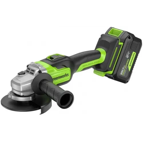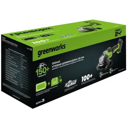 | Комплект поставки | Угловая шлифмашина Greenworks GD24AG; АКБ 8Ач — 1 шт; Быстрое зарядное устройство Greenworks G24C4, 24V, 4А (2946407); Защитный кожух; Боковая рукоятка; Опорный фланец; Зажимная гайка; Ключ; Руководство по эксплуатации; Гарантийный талон; Картонная коробка. |