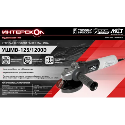 Углошлифовальная машина Интерскол УШМВ-125/1200Э 1200Вт 10000об/мин рез.шпин.:M14 d=150мм (915.0.0.40)