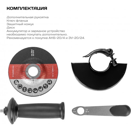 | Комплект поставки | Машина шлифовальная угловая аккумуляторная, руководство по эксплуатации, дополнительная рукоятка, ключ фланца, защитный кожух, диск. |