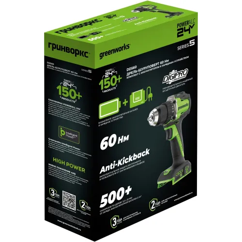 | Комплект поставки | Дрель-шуруповерт Greenworks DD560, поясная клипса + винт, 2 хАКБ 2Ач, зарядное устройство, руководство по эксплуатации, гарантийный талон. |