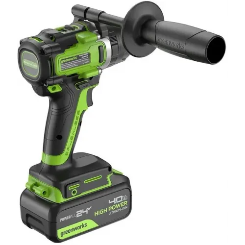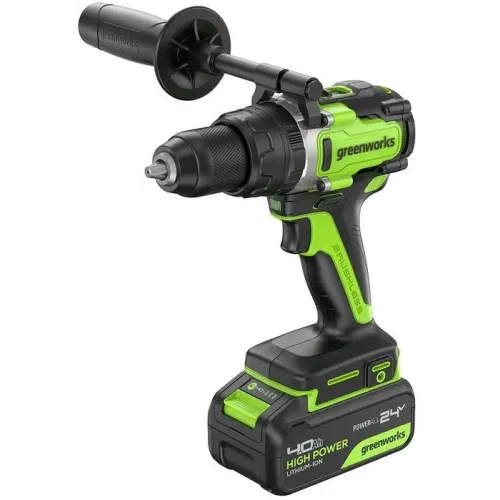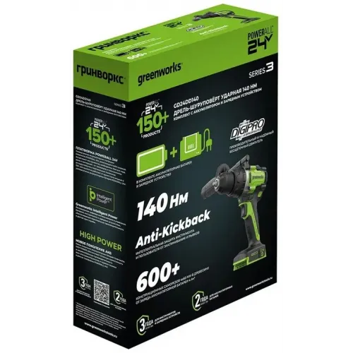 | Комплект поставки | Дрель-шуруповерт ударная Greenworks GD24DD140; переставляемая боковая рукоятка; поясная клипса + винт; 2 хАКБ 4Ач; зарядное устройство 4А; руководство по эксплуатации; гарантийный талон. |